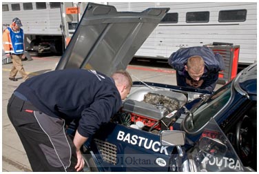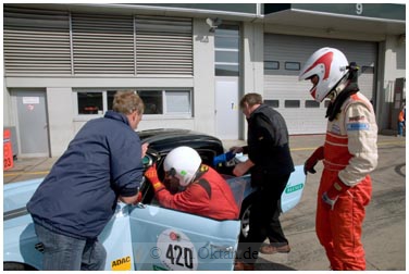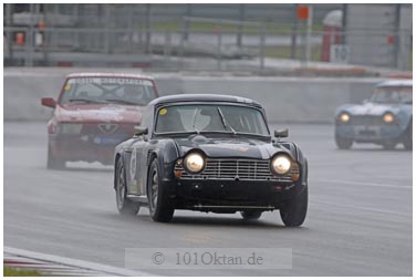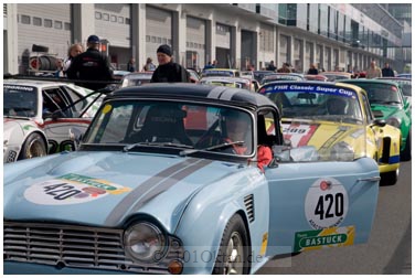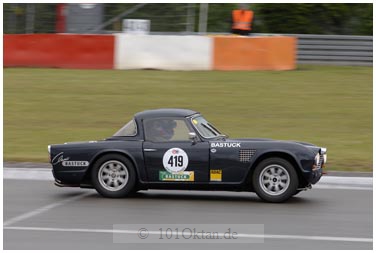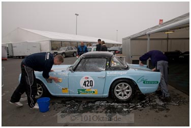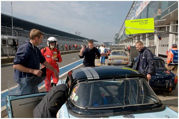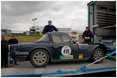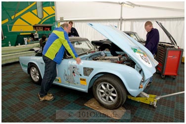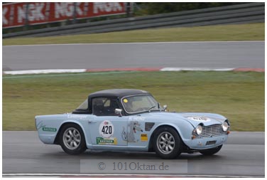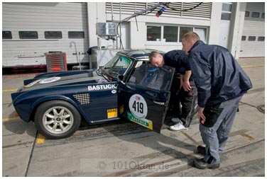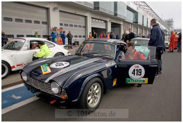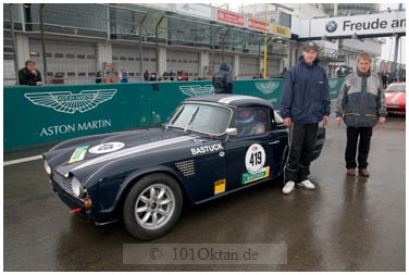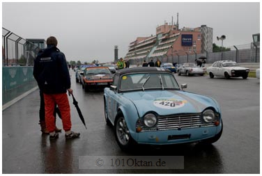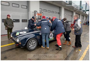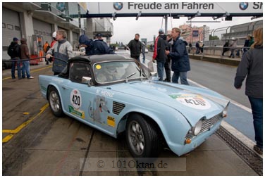 420 Triumph TR4 in der Schlange an der Boxenausfahrt