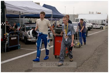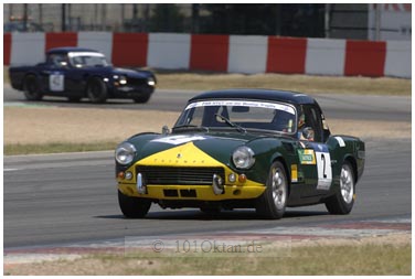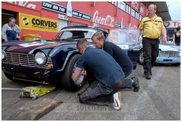 41 Triumph TR4 mit Fahrer und Mechanikern