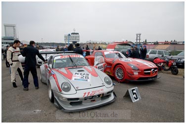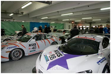 Rennwagen in den Boxen