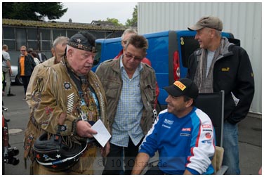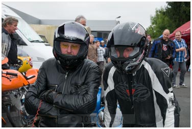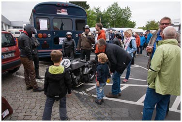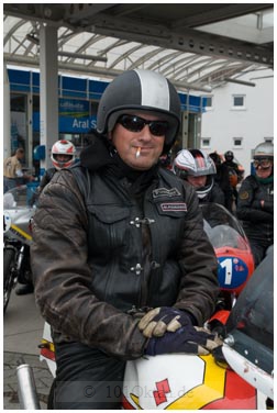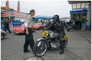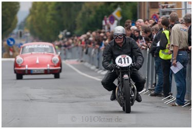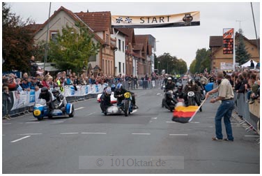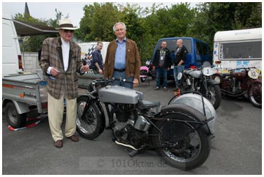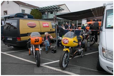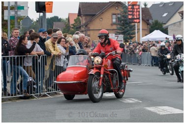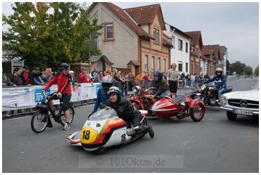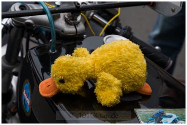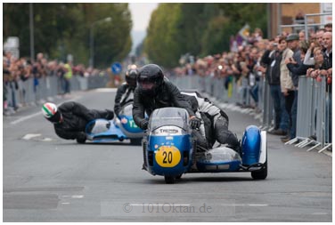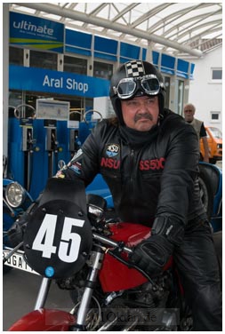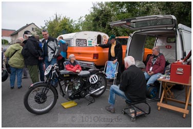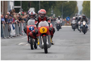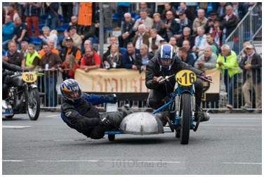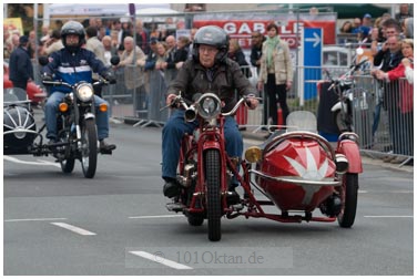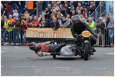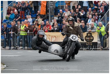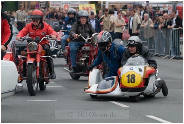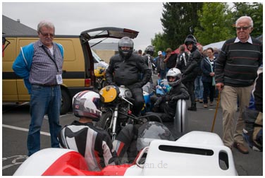Je näher man dem Fahrerlager und der Rennstrecke kommt, desto lauter wird es. Auch der Geruch wird intensiver. Hier und da heulen Motoren auf, begleitet von hellem Qualm. Dazwischen erklären Edgar Lossnitzer und Peter Hoff die Besonderheiten des Gespannfahrens. Der Laie darf sich sogar selbst einmal als „Turner“ – wie Lossnitzer den Beifahrer nennt – versuchen. Der Beiwagen seiner „Norton Manx“, Baujahr 1955, ist eigentlich eine Pritsche mit mehreren Haltgriffen. Auf sie legt man sich nicht einfach drauf und macht es sich dann gemütlich. Der „Turner“ springt vielmehr beim Anfahren auf die Pritsche und übernimmt während des Rennens die Regie.