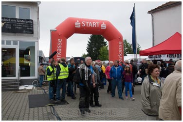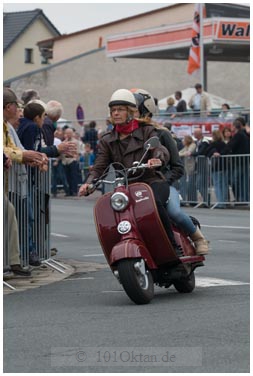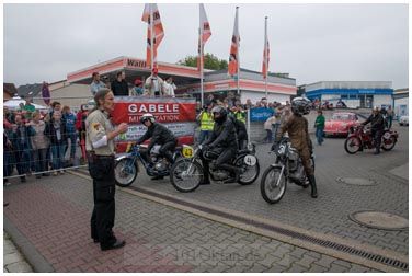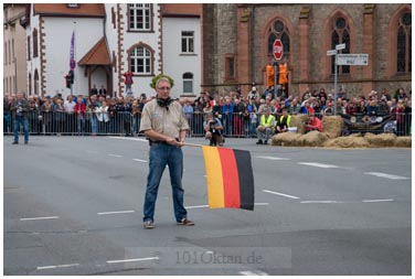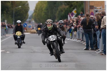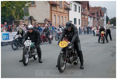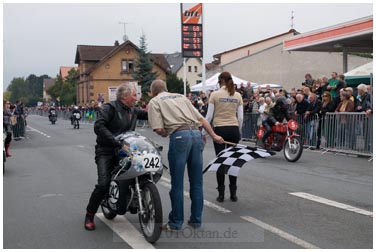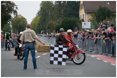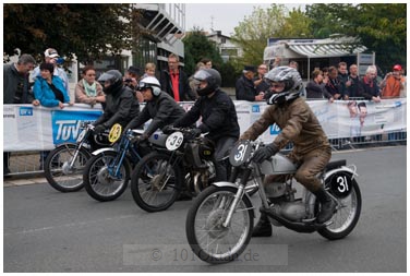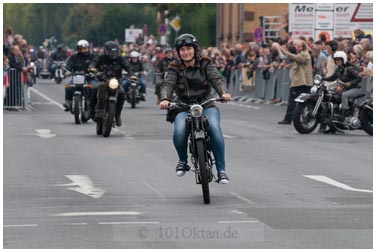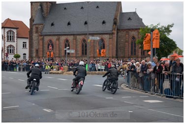 Dann werden die Fahrer gebeten, sich am Platz neben Start- und Zielpunkt zu versammeln. Die 3,3 Kilometer lange, vom Verlauf dreieckige Rennstrecke, die an der Aschaffenburger Straße beginnt und über die K128 und die Groß-Umstädter Straße zurück zum Ausgangspunkt führt, wird in wenigen Minuten freigegeben. Das erste Rennen – ein Schaulaufen der Motorräder bis Baujahr 1976 – fährt Karin Böhle allein auf einer NSU Max aus dem Jahr 1957. Als sie auf ihr Gefährt steigt und den Motor anlässt, ist es wirklich da, das Leuchten in den Augen.