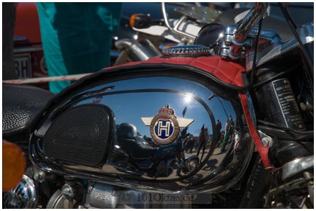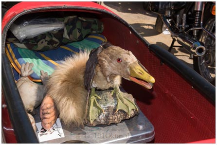 Sehr auffällig ist bei den historischen Zweirädern eine Indian mit Seitenwagen. Ihre Frontscheibe ist mit Aufklebern und einer Gummischlange bestückt. Auch Plastikhandschuhe, ein Tollwutschild und eine Entenfigur zieren sie.